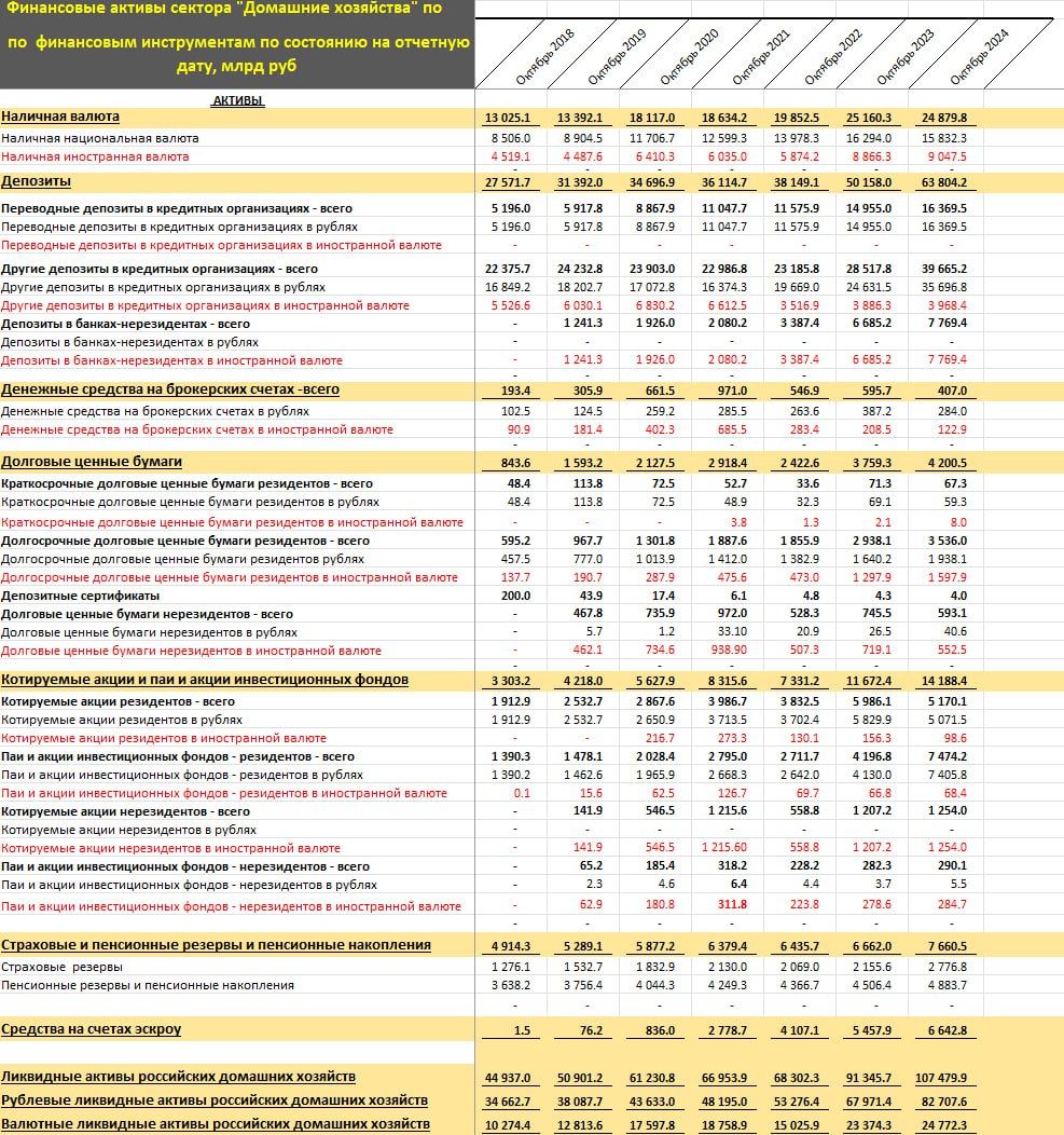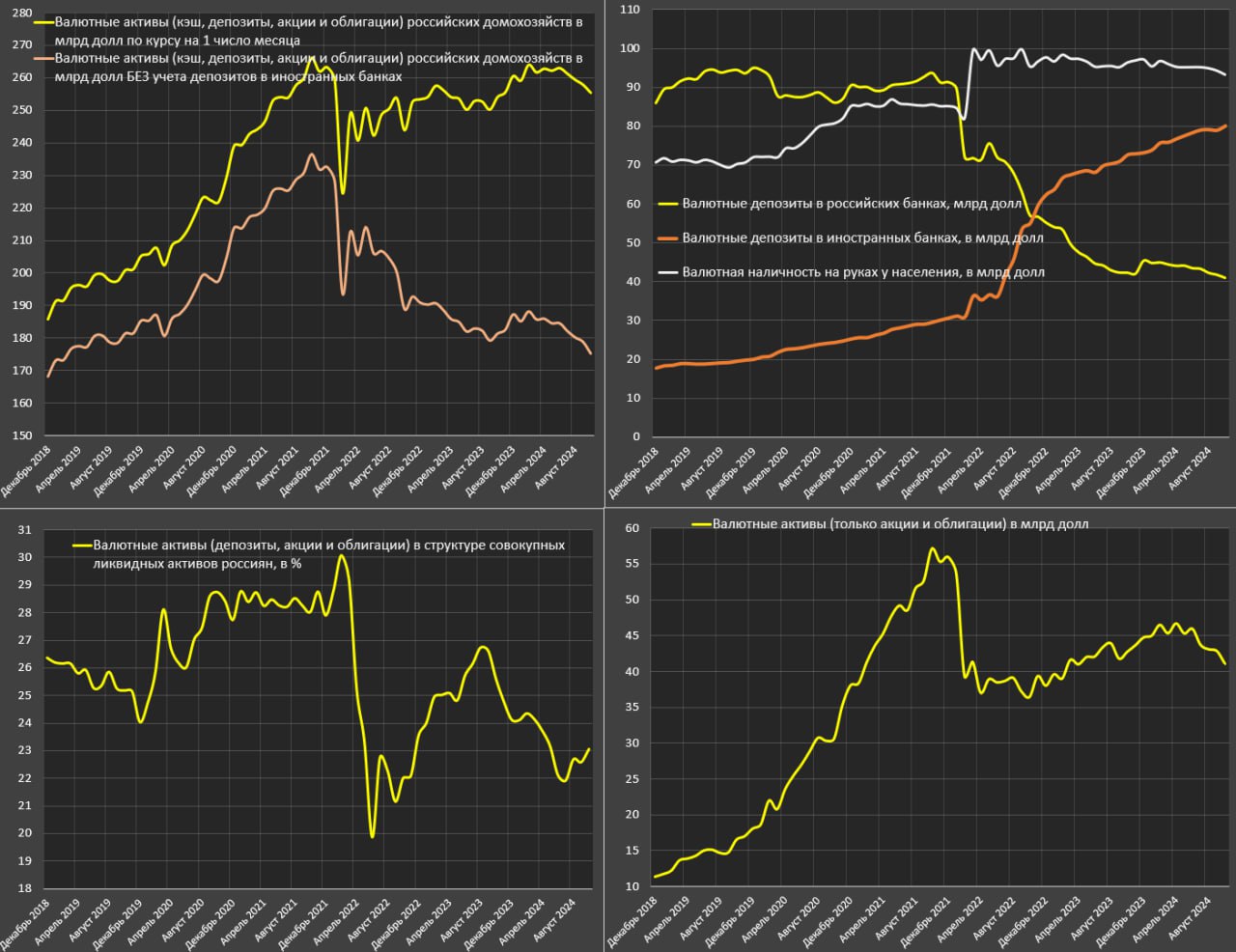 Если исключить денежные активы и кэш, в акциях и облигациях в иностранной валюте всего $41 млрд – минимум с апр.23, причем существенная часть сидит в квазинерезидентах и российских замещающих облигациях.