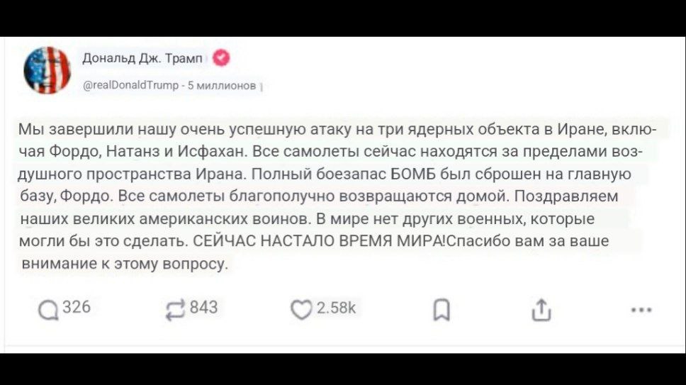 Трамп не стал тянуть с заявлениями — он назвал случившееся «историческим моментом» для США, Израиля и всего мира, предложил Тегерану «закончить войну» и пообещал новые атаки в случае отказа. Вслед за этим Госдепартамент США срочно попросил всех граждан США немедленно покинуть Иран