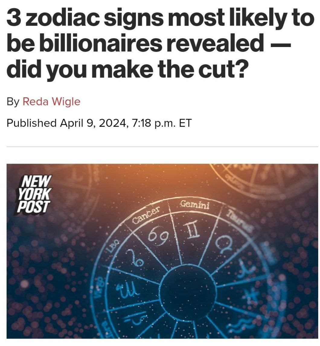 Астрологи изучили дни рождения миллиардеров и выяснили, что у трех знаков зодиака есть больше шансов стать ими — это Весы, Рыбы и Телец. Около 88% миллиардеров — мужчины, 65% — белые, а 90% — люди в возрасте 50 лет и старше.