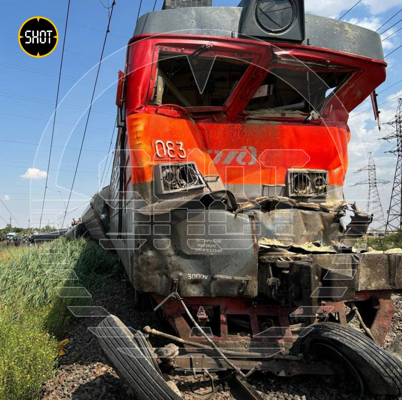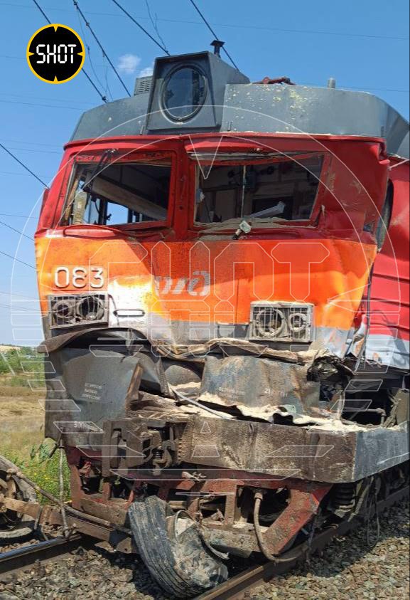 Так сейчас выглядит локомотив поезда. Машинисты применили экстренное торможение, чтобы предотвратить аварию с КАМАЗом, но это не спасло от столкновения, сообщил SHOT источник.