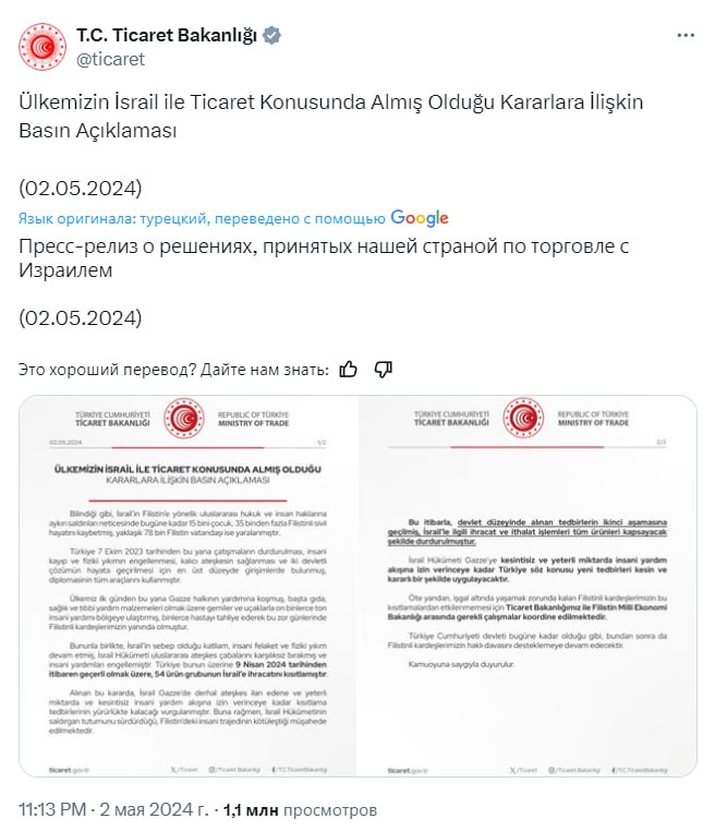 Турция прекратила торговлю с Израилем Минторг Турции заявил, что страна будет соблюдать торговые санкции в отношении еврейского государства до прекращения огня в Газе. «Начата реализация второго этапа мер, принятых на государственном уровне. Экспортно-импортные операции с Израилем прекращены для всех групп товаров», – говорится в заявлении. Турция будет строго и решительно осуществлять эти новые меры, отмечается в документе. Подписывайтесь на «Абзац»