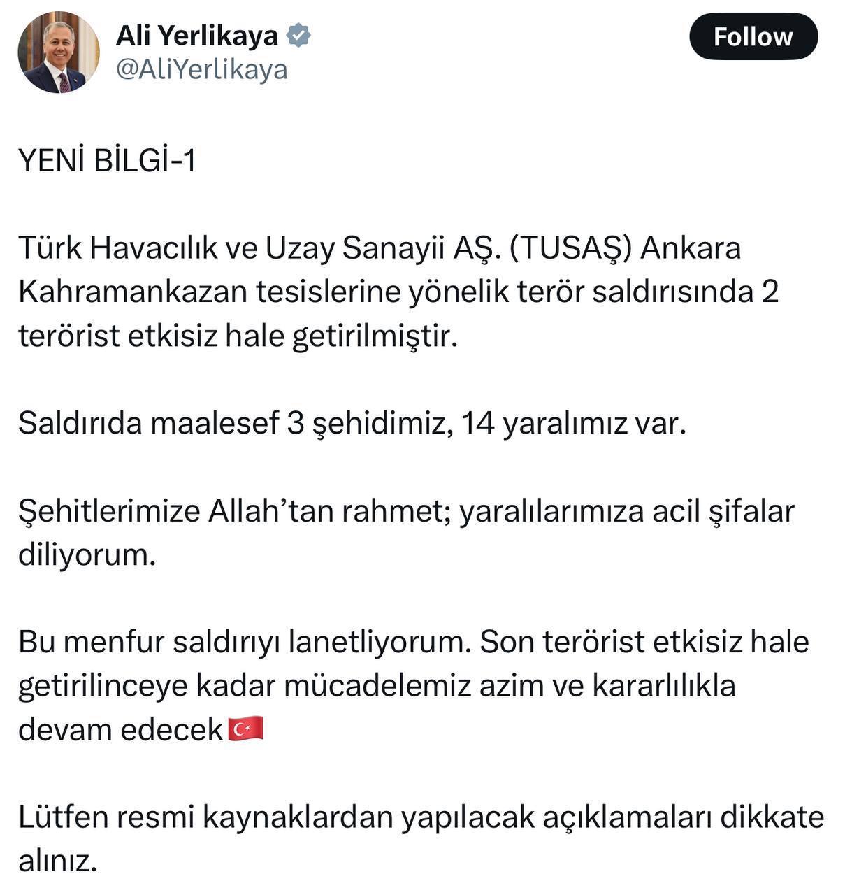 🖥️ «Террористы были нейтрализованы. К сожалению, в результате нападения погибли 3 человека и 14 получили ранения. Я желаю милости Аллаха нашим мученикам и скорейшего выздоровления нашим раненым. Я осуждаю это чудовищное нападение. Наша борьба будет продолжаться с решимостью и решимостью до тех пор, пока не будет нейтрализован последний террорист», заявил Министр внутренних дел Турции Али Ерликая.