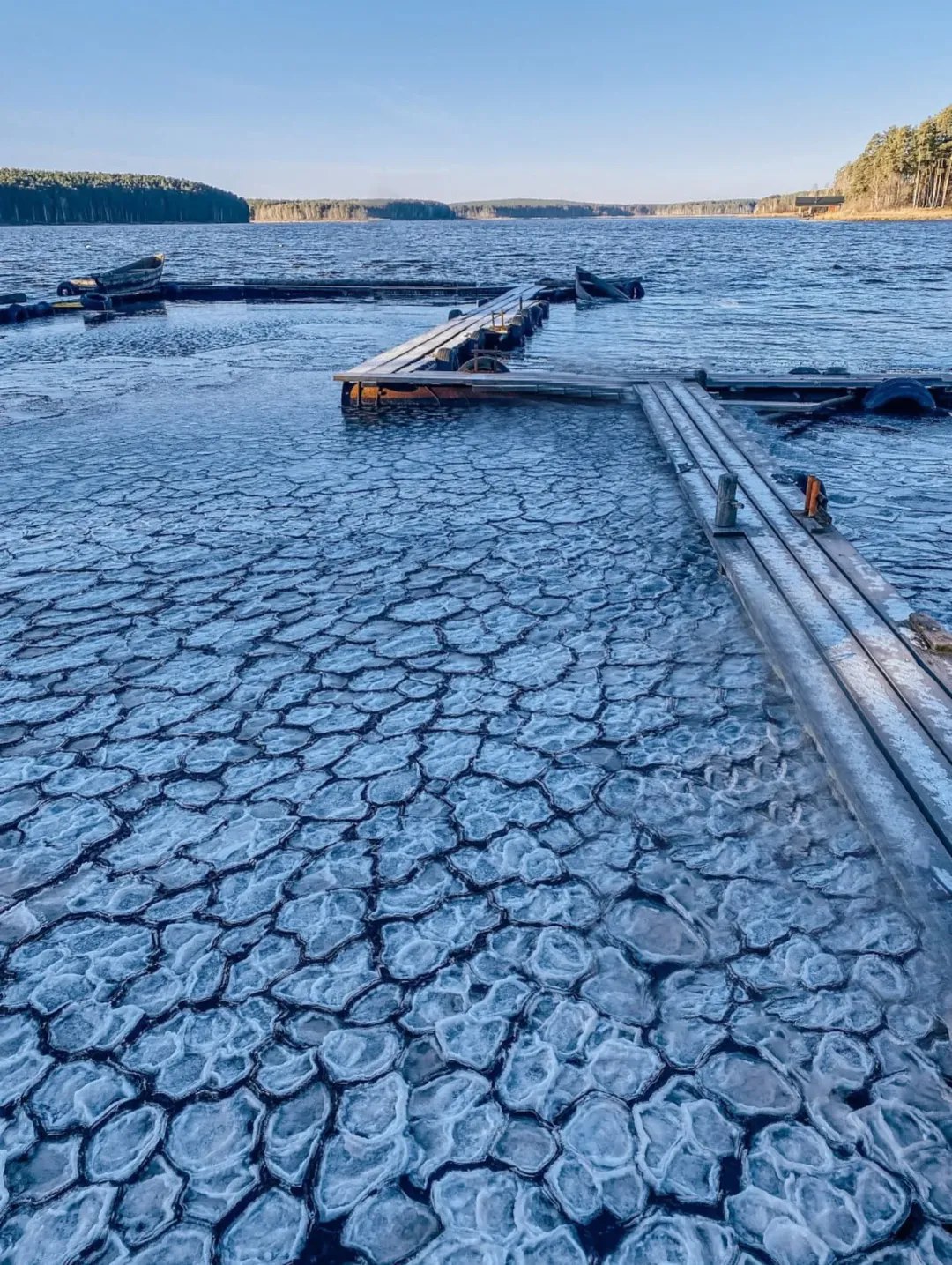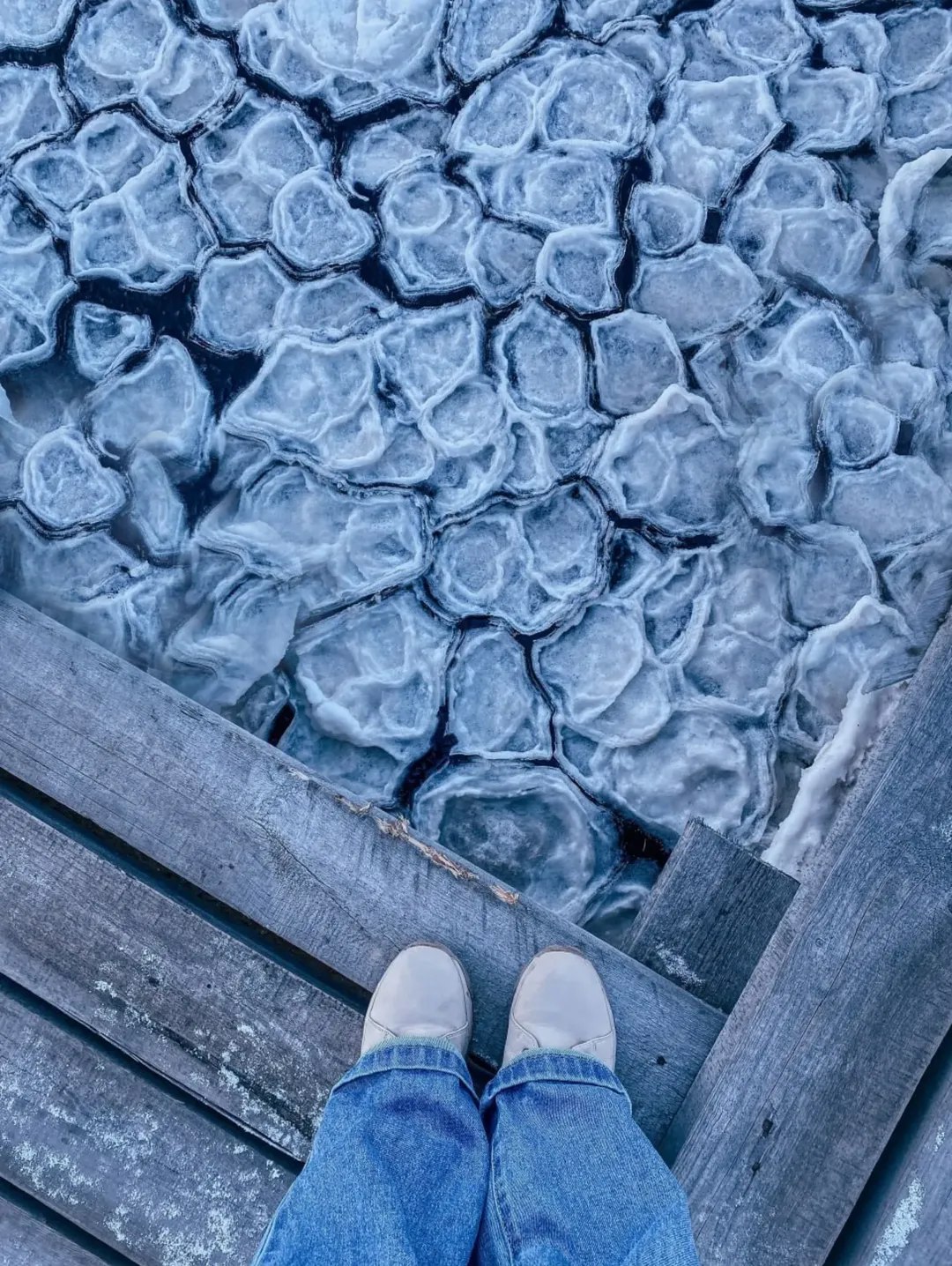 Это одна из стадий ледостава — процесса образования льда на воде. Толстые слои льда раскалываются и, сталкиваясь друг с другом, формируют ровные «блинчики», плавающие на поверхности. Кажется, будто озеро украшено сотнями гигантских ледяных кружков.