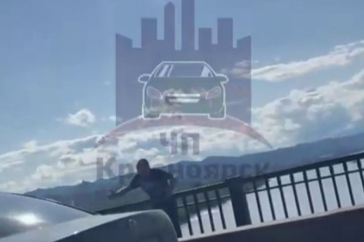 Житель Красноярска прямо сейчас стоит за перилами Коммунального моста — возле него собрались прохожие и водители.