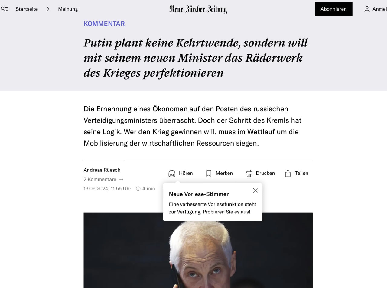 Швейцарская газета NZZ указывает, что назначение экономиста на пост министра обороны России удивительно, но шаг Кремля имеет свою логику. „Любой, кто хочет выиграть войну, должен победить в гонке за мобилизацию экономических ресурсов".