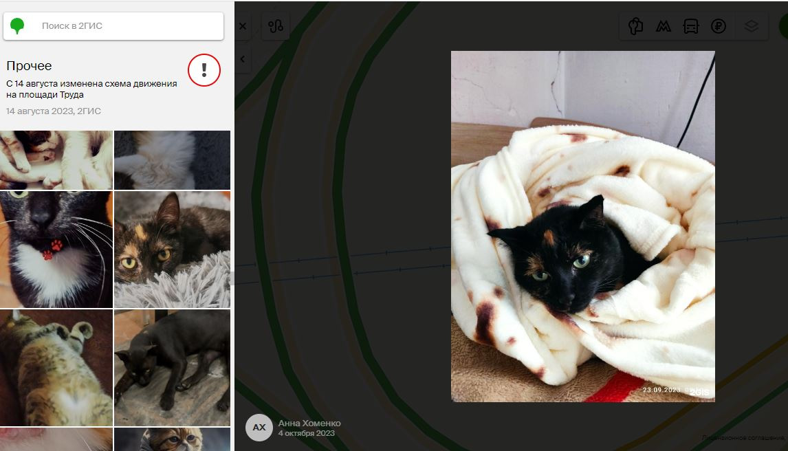 Первый снимок опубликовали 5 сентября. Флешмоб с животными поддержали и в самом 2ГИС, выложив информацию об этом. Также иногда пользователи, оказавшись в большой пробке, подбадривают друг друга сообщениями на картах, например, желают доброго утра, поздравляют с праздниками, передают привет знакомым.