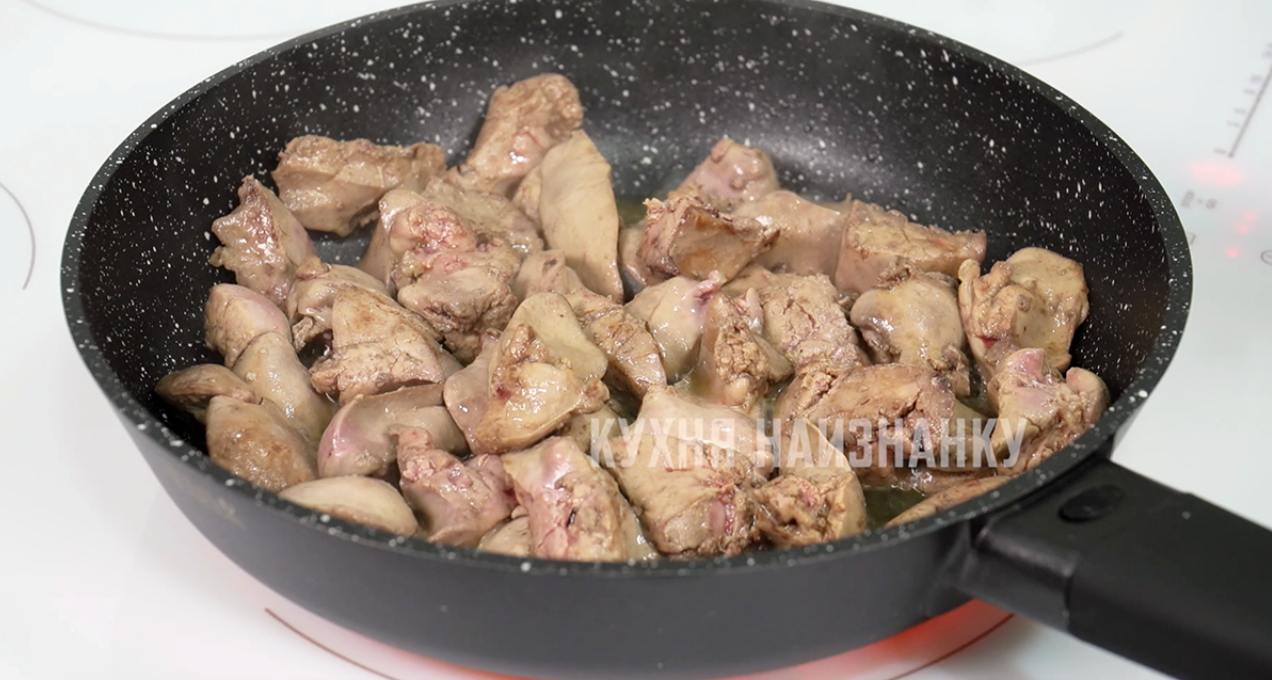Печень нарезаю на кусочки и также совсем слегка обжариваю. Это даже обжариванием не назовешь - просто слегка прогреваю со всех сторон. Солю по вкусу.