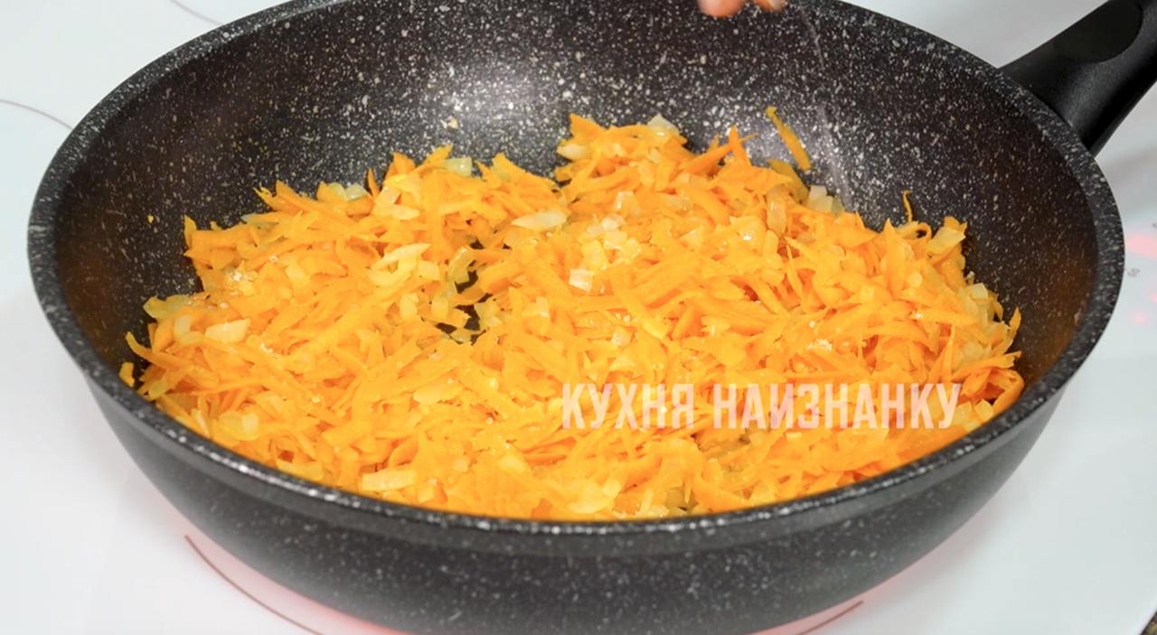 Вначале слегка обжариваю на небольшом количестве растительного масла лук и морковь.