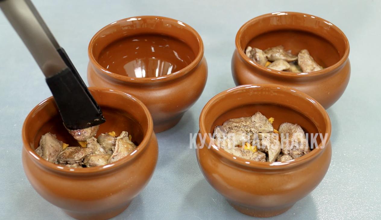 Раскладываю в горшочки овощи, а сверху - кусочки печени. Печень у меня куриная, но любая подойдет! Добавляю в каждый горшочек по кусочку лаврового листа.