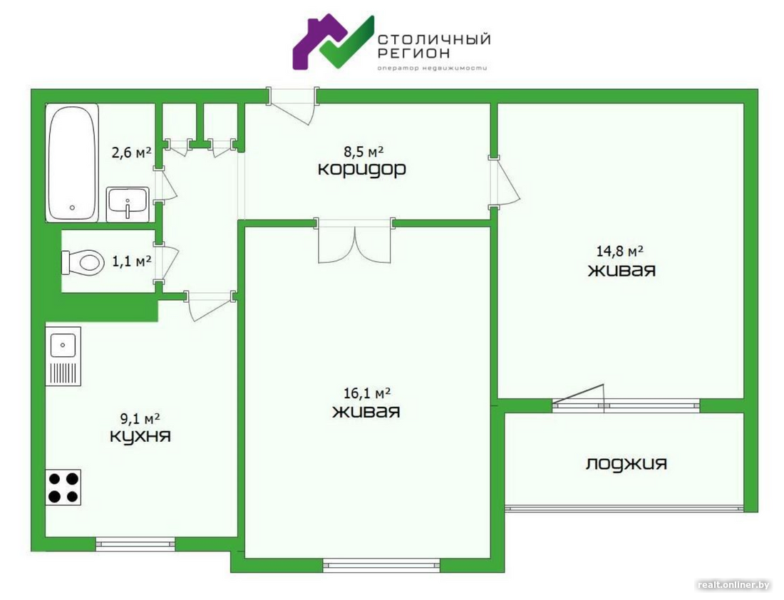 Общая площадь — 52,8 кв. м. В ней есть две изолированные комнаты (16,1 и 14,8 кв. м) с выходом на лоджию, а также просторная кухня (9,1 кв. м). Сам дом расположен в середине квартала с развитой инфраструктурой. В 100 метрах находится лесопарк для прогулок, магазин «Байкальский», остановки общественного транспорта, удобный выезд на МКАД. До станции метро «Могилевская» всего 15 минут пешком.