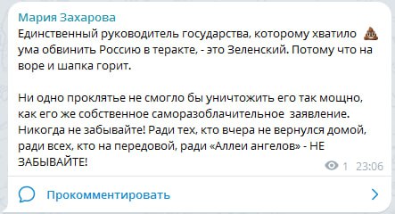 Захарова ответила Зеленскому, который заявил о виновности российской стороны в теракте в "Крокусе".