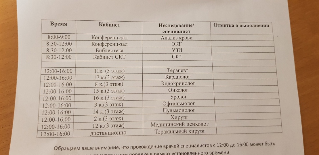 Время прохождения обследования: воскресенье, с 8.00 до 16.00.