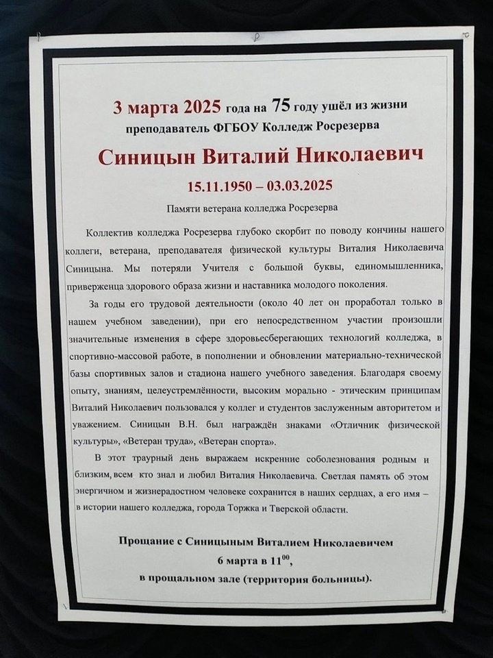 В субботу, 3 марта, в Торжке Тверской области в возрасте 74 лет умер преподаватель колледжа Росрезерва Виталий Синицын.