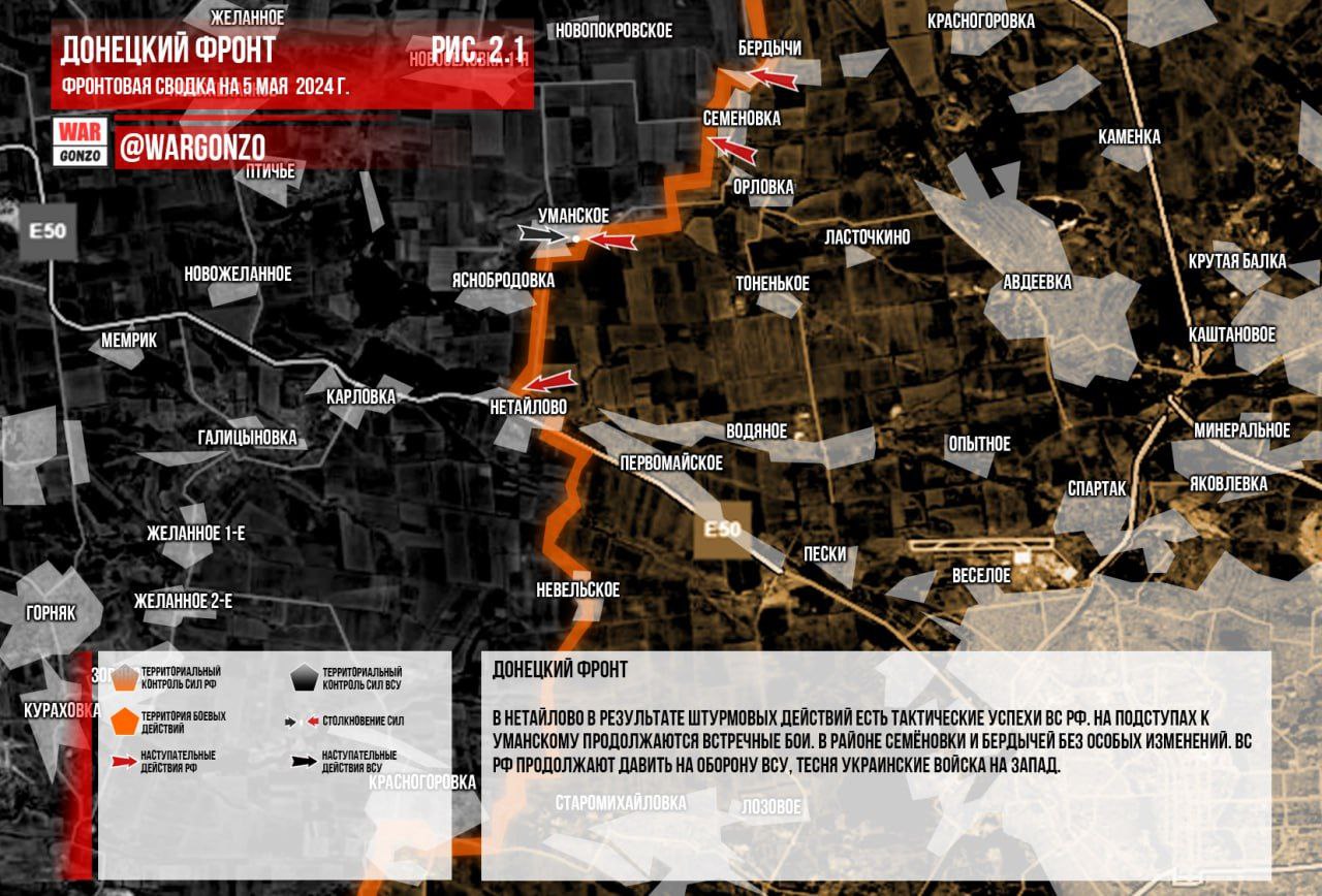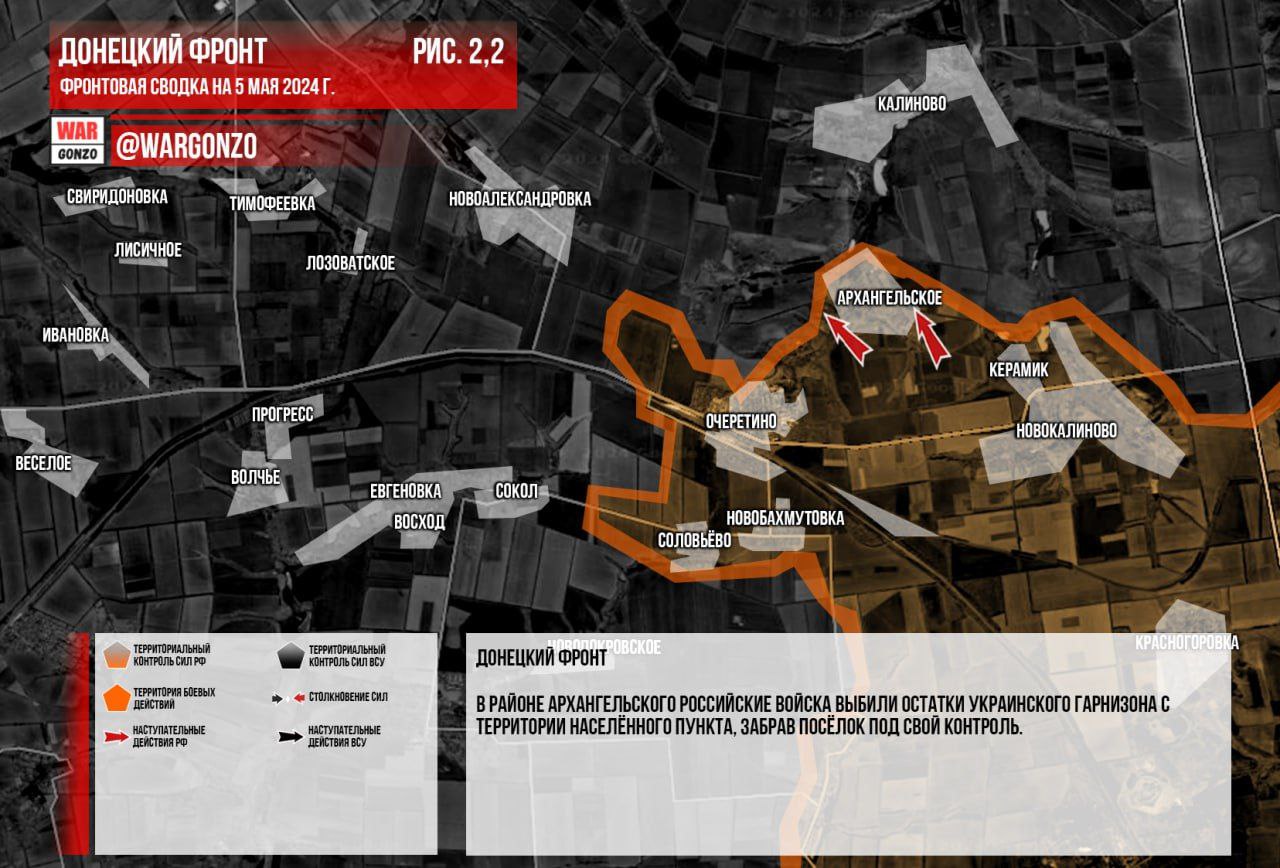 Донецкий фронт. В Красногоровке российские войска продвинулись в районе Огнеупорного завода. В Георгиевке и в Нетайлово в результате штурмовых действий есть тактические успехи ВС РФ. На подступах к Уманскому продолжаются встречные бои. В районе Семёновки и Бердычей без особых изменений. ВС РФ продолжают давить на оборону ВСУ, тесня украинские войска на запад. В районе Архангельского российские войска выбили остатки украинского гарнизона с территории населённого пункта, забрав посёлок под свой контроль. (Рис. 2)