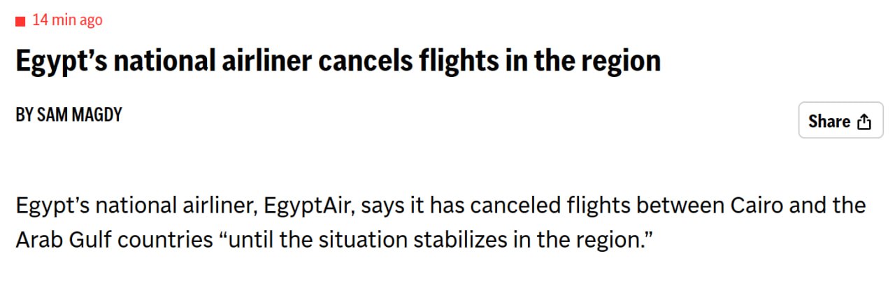 πͺπ¬βοΈ EgyptAir ΠΎΡΠΌΠ΅Π½ΡΠ΅Ρ ΡΠ΅ΠΉΡΡ ΠΌΠ΅ΠΆΠ΄Ρ ΠΠ°ΠΈΡΠΎΠΌ ΠΈ ΡΡΡΠ°Π½Π°ΠΌΠΈ ΠΠ΅ΡΡΠΈΠ΄ΡΠΊΠΎΠ³ΠΎ Π·Π°Π»ΠΈΠ²Π° Β«Π΄ΠΎ ΡΡΠ°Π±ΠΈΠ»ΠΈΠ·Π°ΡΠΈΠΈ ΡΠΈΡΡΠ°ΡΠΈΠΈ Π² ΡΠ΅Π³ΠΈΠΎΠ½Π΅Β» β AP