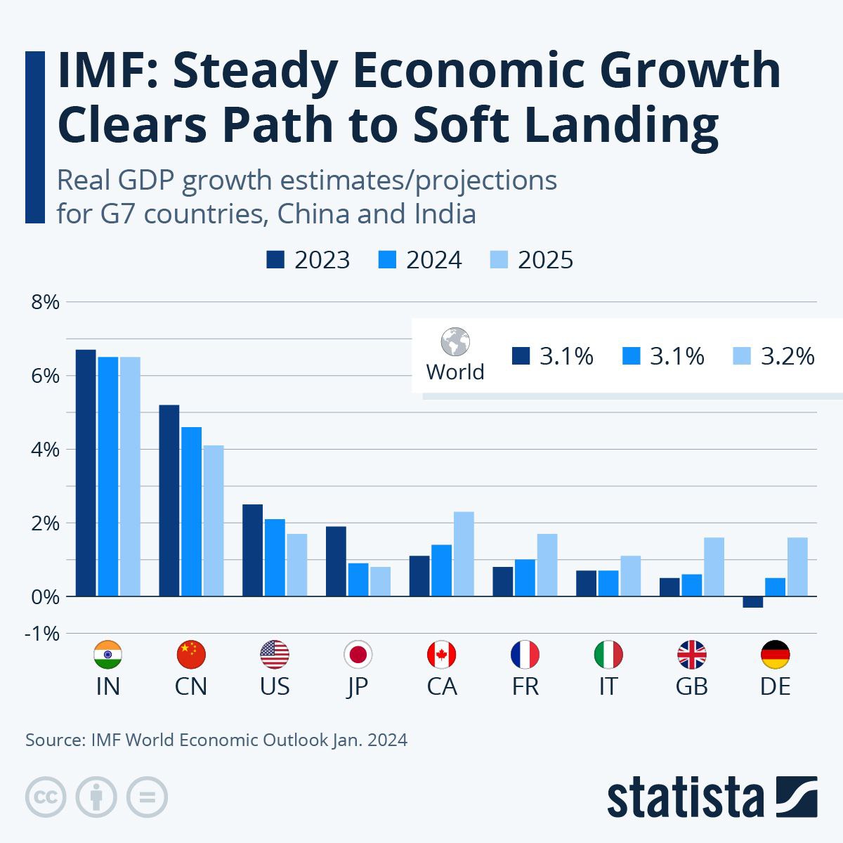 📊Последние оценки/прогнозы роста реального ВВП Индии, Китая и стран G7 в 2023, 2024 и 2025 годах от МВФ