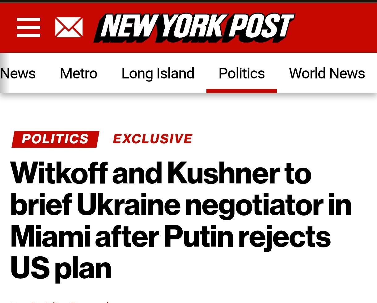 Посол Украины в США Ольга Стефанишина подтвердила сегодняшнюю встречу спецпосланника Уиткоффа и Кушнера с Умеровым в Майами.