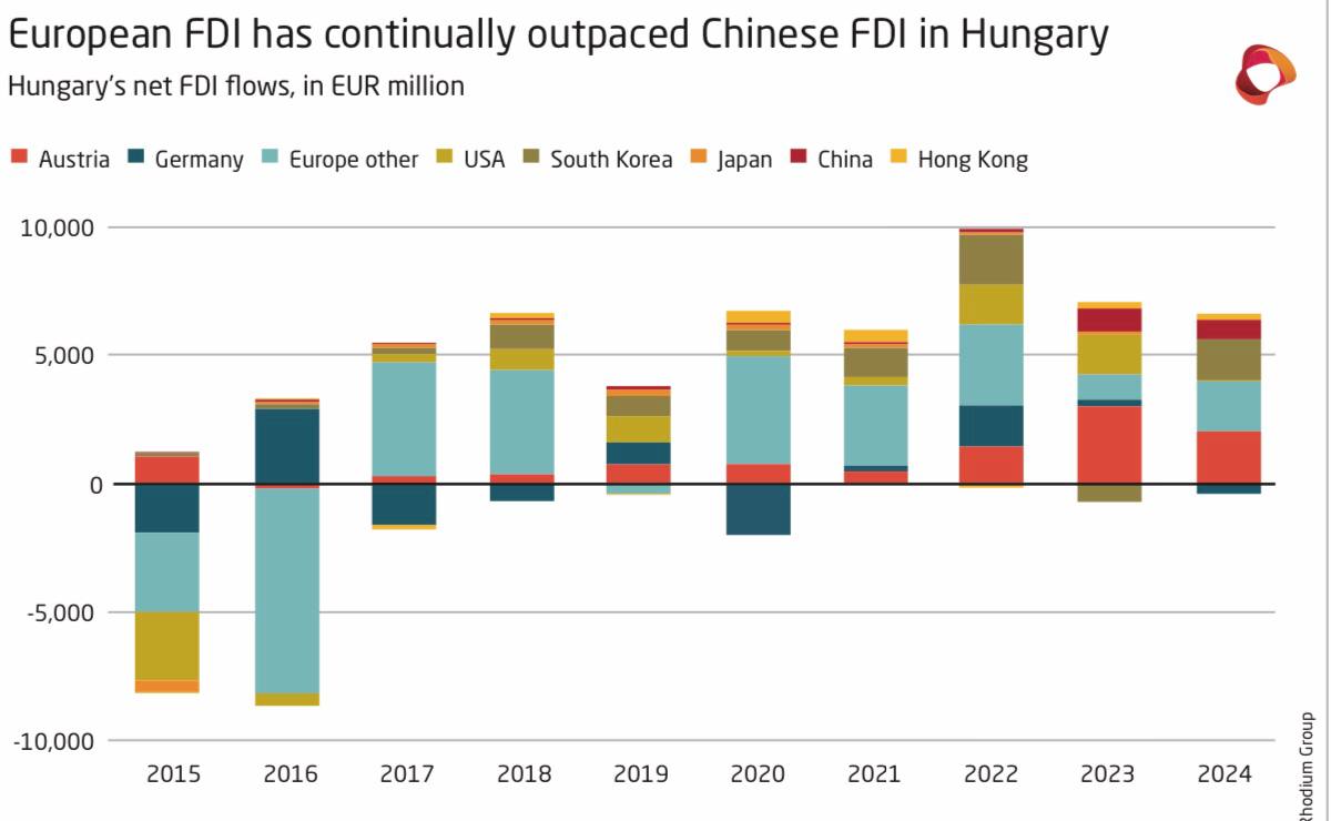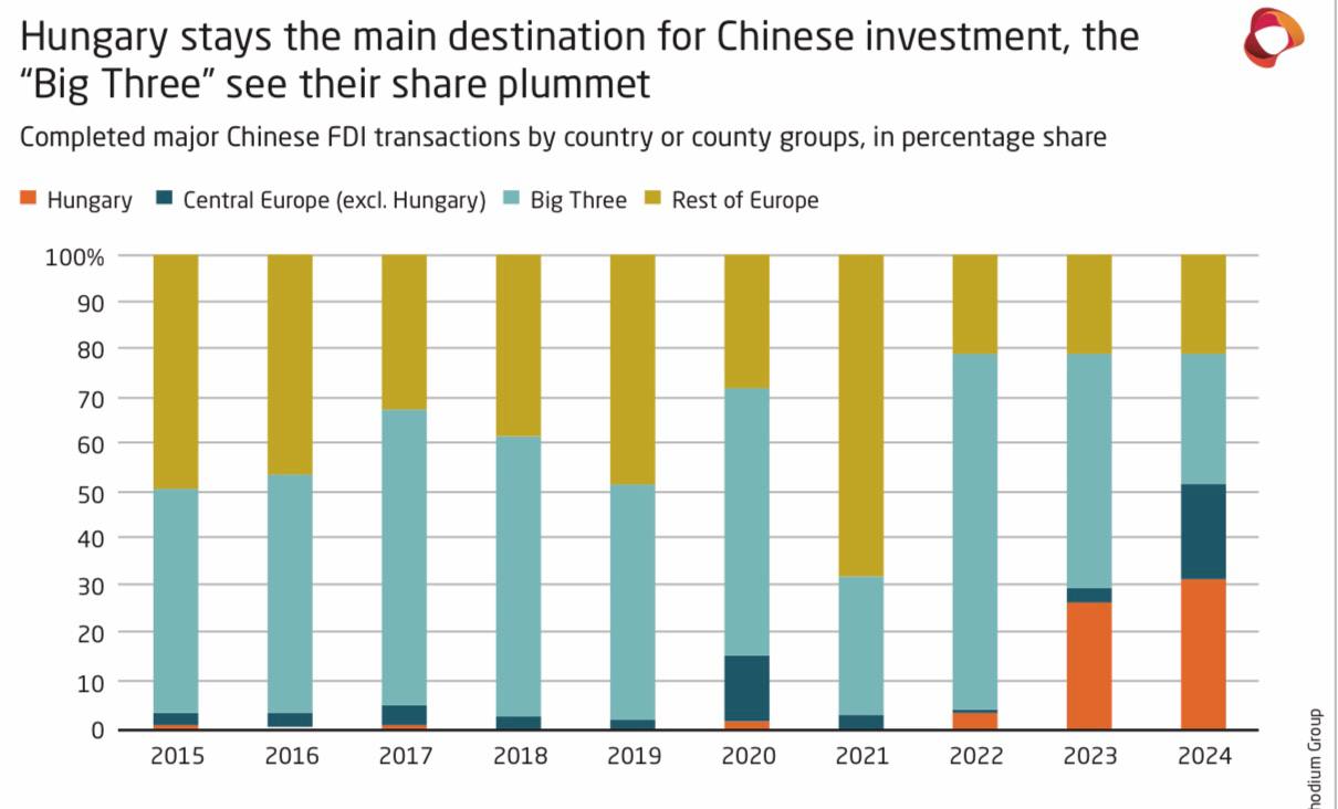 На этом фоне Венгрия уверенно вышла в лидеры. В 2024 году страна стала крупнейшим получателем китайского капитала в Европе, привлекая 3,1 миллиарда евро - это 31% от общего объема инвестиций. Для сравнения, на три крупнейшие экономики - Великобританию, Германию и Францию - вместе пришлось лишь 20%. Еще несколько лет назад так называемая «большая тройка» удерживала свыше половины всех китайских вложений в регионе. Сегодня география резко сместилась.