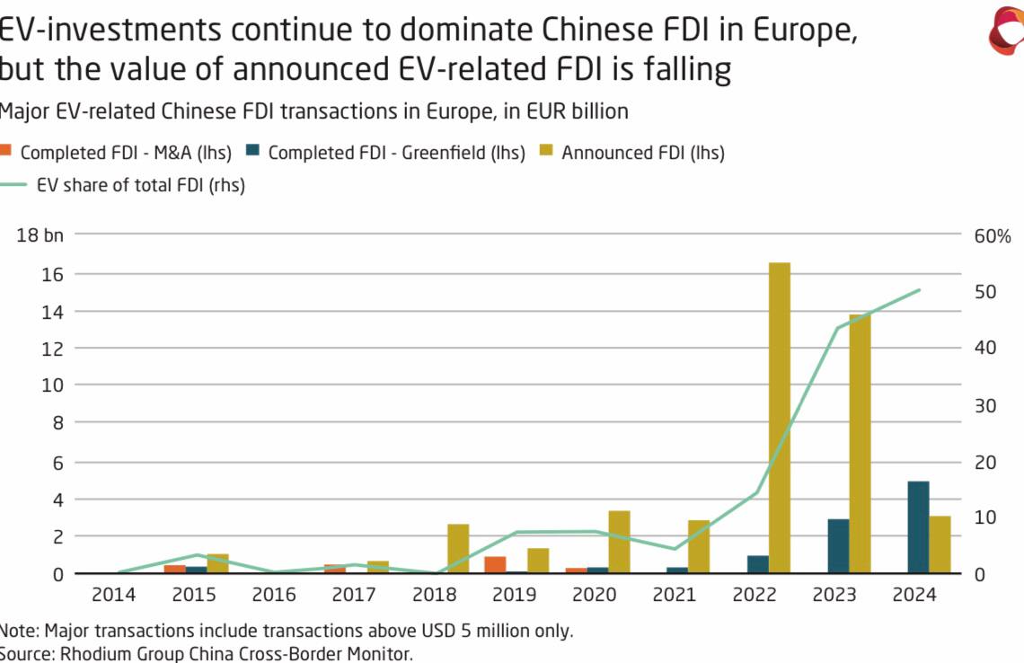 После семи лет спада китайские инвестиции возвращаются в Европу. В 2024 году объем FDI из КНР в страны ЕС и Великобританию достиг 10 миллиардов евро - почти на 50% больше, чем годом ранее. Это первое заметное восстановление с 2016 года и четкий сигнал: Пекин вновь активизирует экономическое присутствие на европейском направлении. Драйвером роста стали greenfield-инвестиции, особенно в сфере производства аккумуляторов и электромобилей.