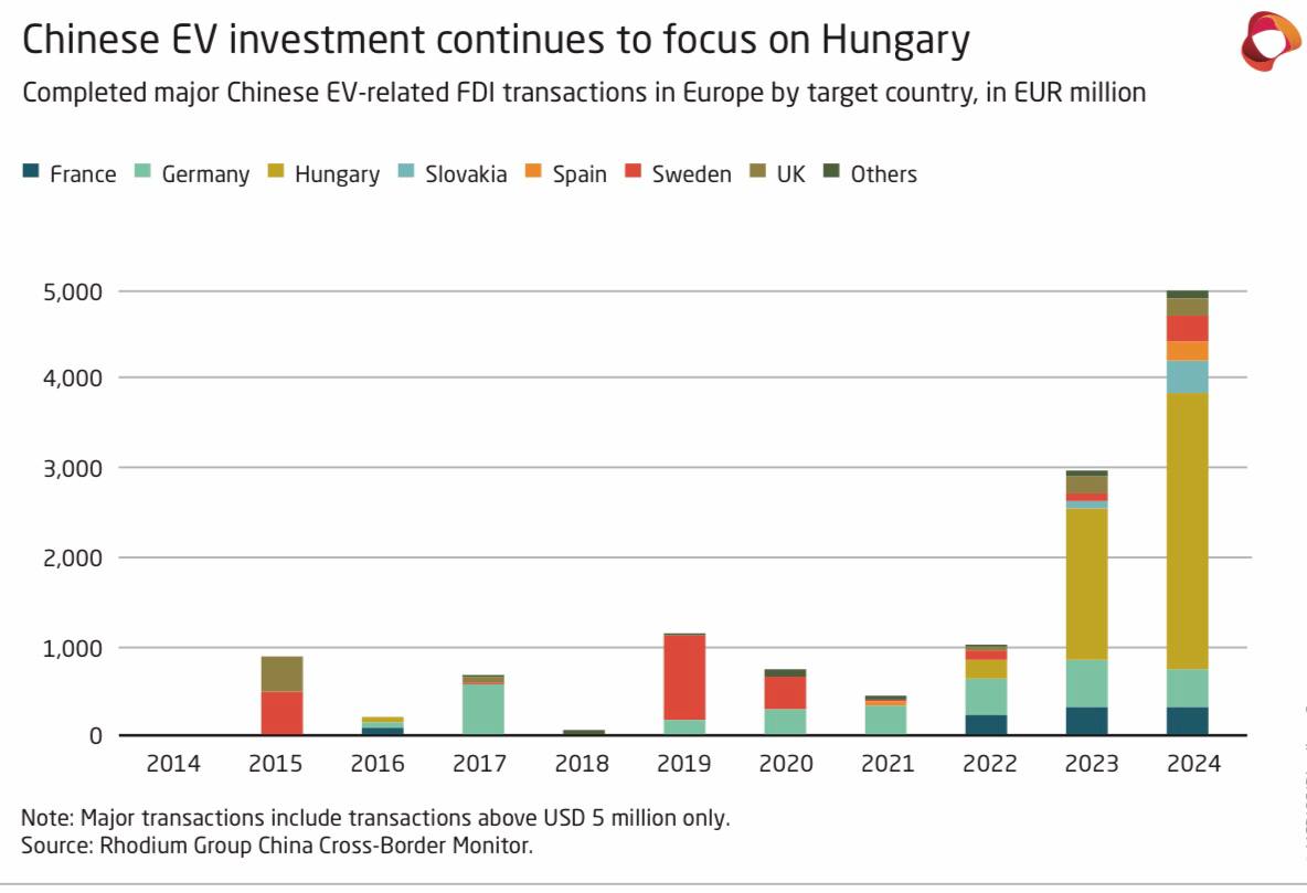 Китайские корпорации быстро воспользовались этими возможностями. В числе крупнейших проектов - гигафабрика аккумуляторов CATL стоимостью 7,5 миллиарда евро, а также заводы EVE Energy, Sunwoda и BYD. Последняя, к тому же, строит собственное предприятие по выпуску электромобилей, объем инвестиций в которое оценивается в 1,4 миллиарда евро. В общей сложности четыре из десяти крупнейших китайских проектов в Европе в 2024 году реализуются именно в Венгрии.