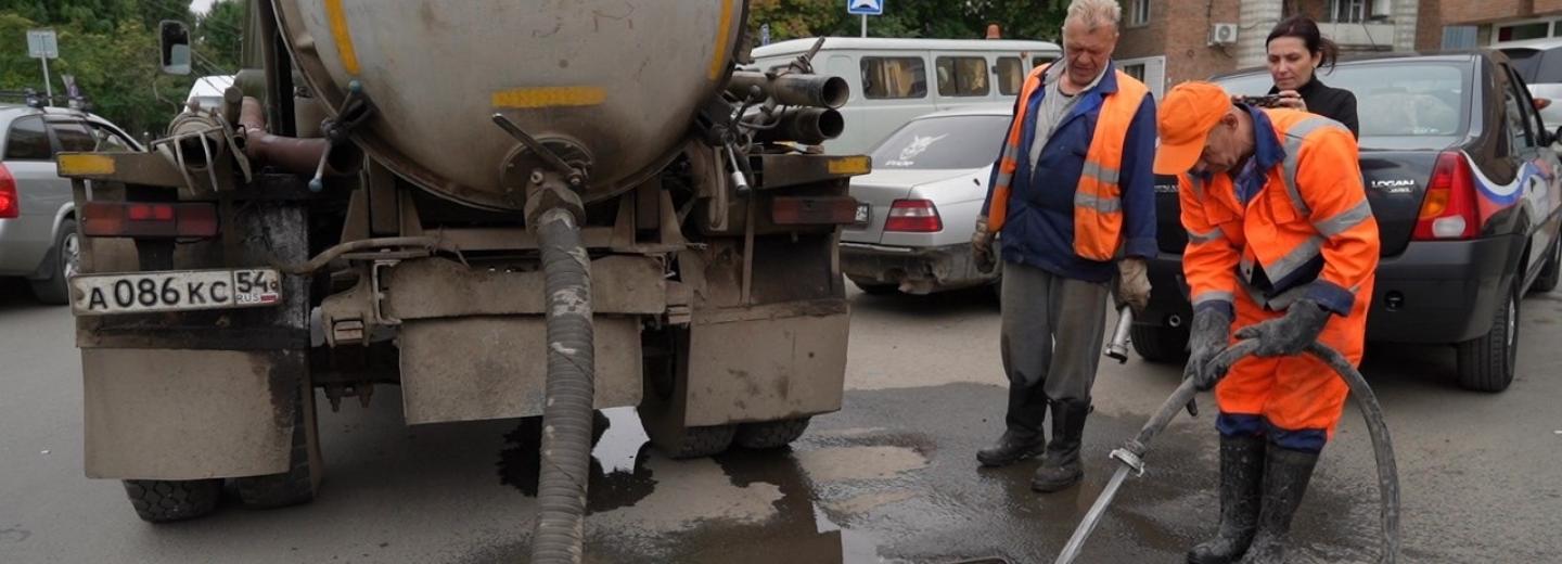 Ливневую канализацию прочищают в Кировском районе Новосибирска. Сегодня, 6 августа, дорожные службы работали на улице Сибиряков-Гвардейцев.