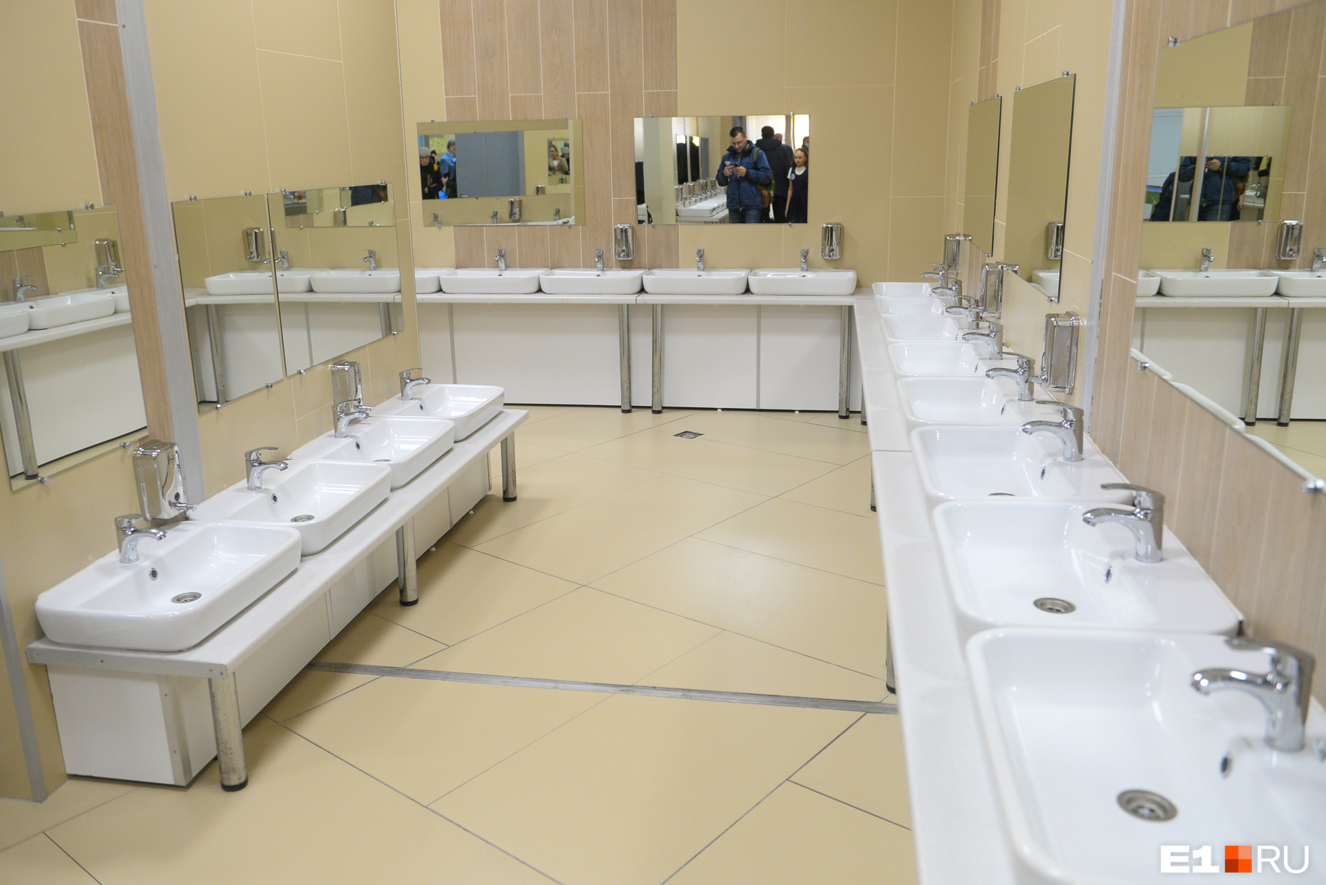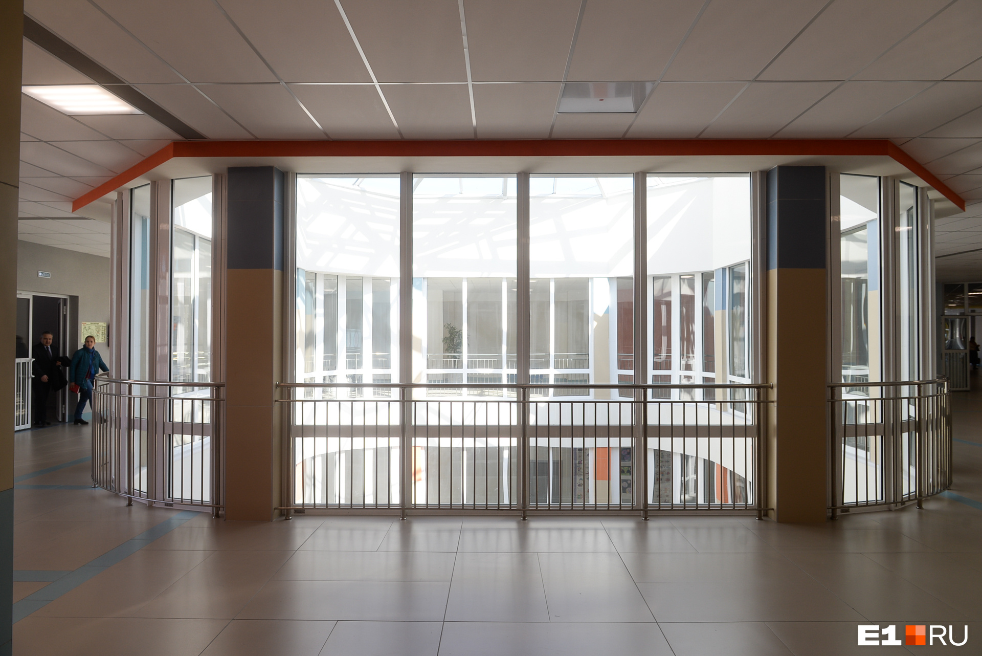 А вот как выглядят учебные кабинеты, столовая и стадион школы. У нее два корпуса, первоклассники учатся во втором. Оба здания построены по одному проекту. Здесь просторные коридоры, шикарный атриум, огромная столовая, а еще отдельные раздевалки для каждого класса.