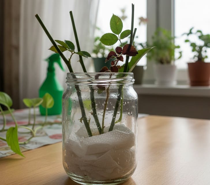 Дальше всё просто: черенки обрезают под углом 45 градусов и устанавливают на бумажный слой. Для создания оптимальной влажности банку опрыскивают изнутри. Растения воспринимают такую среду как рыхлый грунт и начинают быстрее образовывать корни.