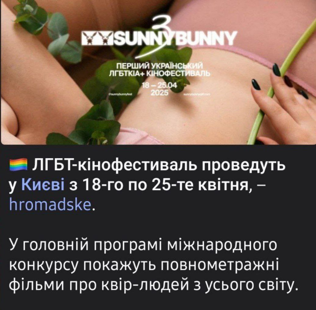 📸 Ценности по-украински: в Страстную Пятницу, 18 апреля 2025 года, в Киеве откроется ЛГБТ*-кинофестиваль «SUNNY BUNNY», — гордо сообщают украинские СМИ. Он будет проходить в Великую Пятницу, Великую Субботу, на Пасху и в дни Светлой седмицы.
