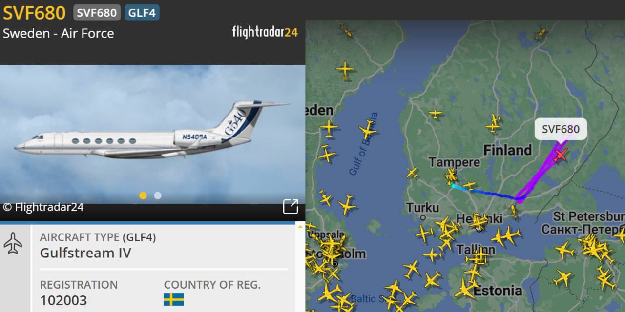 Gulfstream IV шведских ВВС, оборудованный под ведение радиоэлектронной разведки, работает вдоль российской границы в районе Санкт-Петербурга.