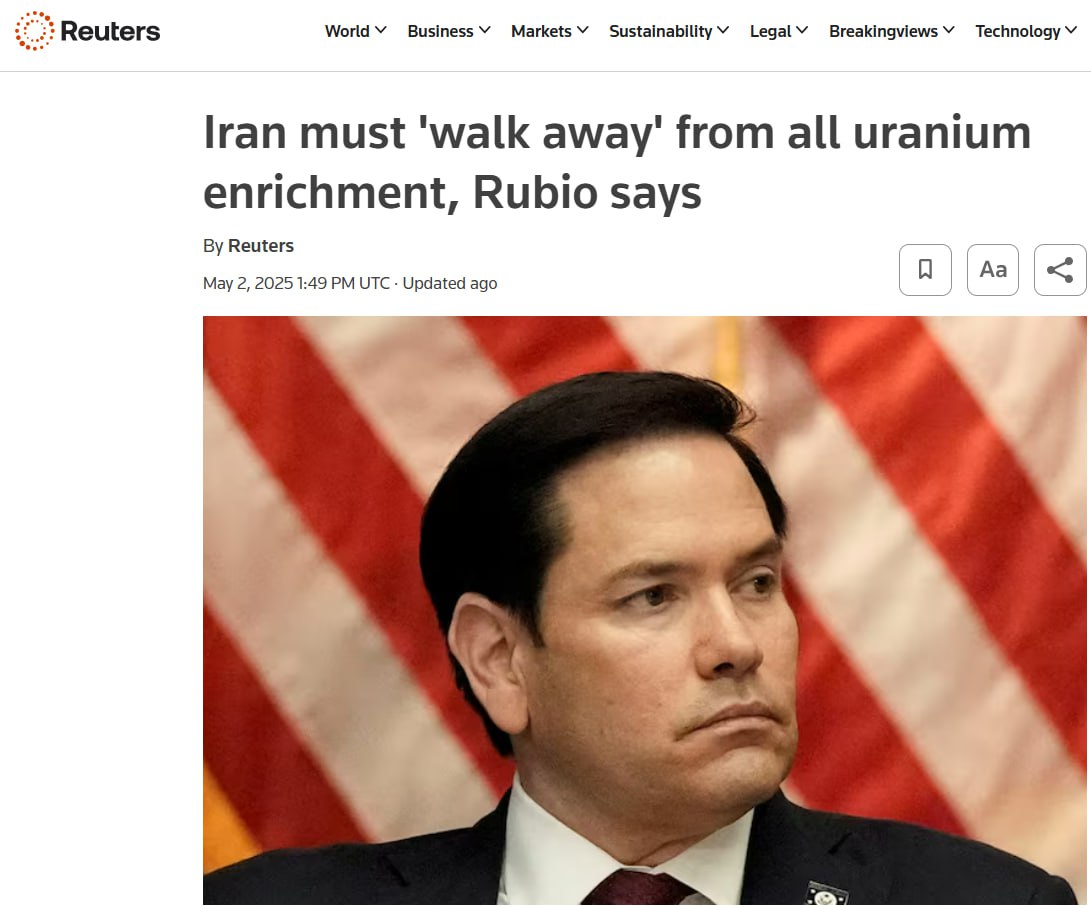 ▪️Рубио заявил, что Ирану стоит покупать обогащённый уран, а не производить его, ведь «от 3,67% до оружейных 90% — вопрос недель». Он также потребовал полного доступа инспекторов, включая военные объекты, с участием американской стороны.