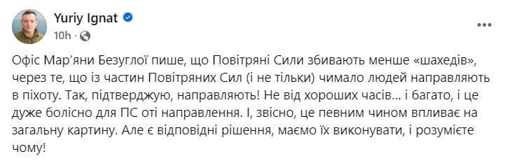 Бывший спикер ВВС Украины Игнат подтвердил заявления Марьяны Безуглой по поводу массовой отправки на фронт личного состава из авиации и ПВО.