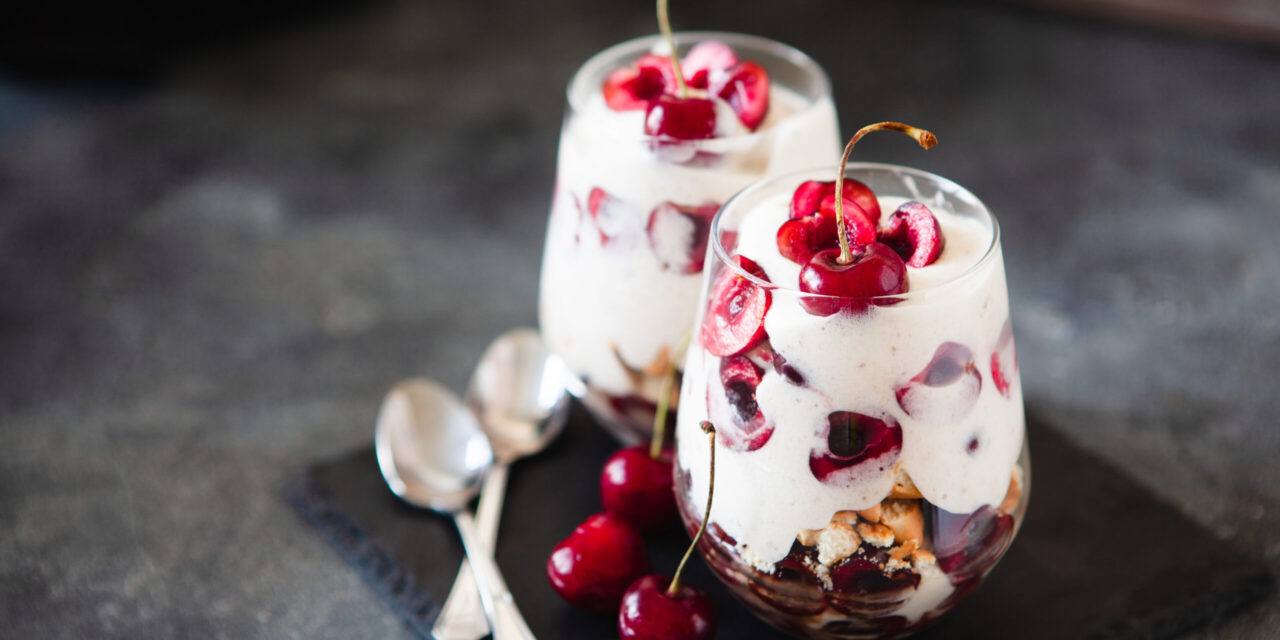 3. В порционные стаканы слоями выложите вишню, взбитые сливки и печенье. По желанию украсьте трайфлы тёртым шоколадом и орехами.