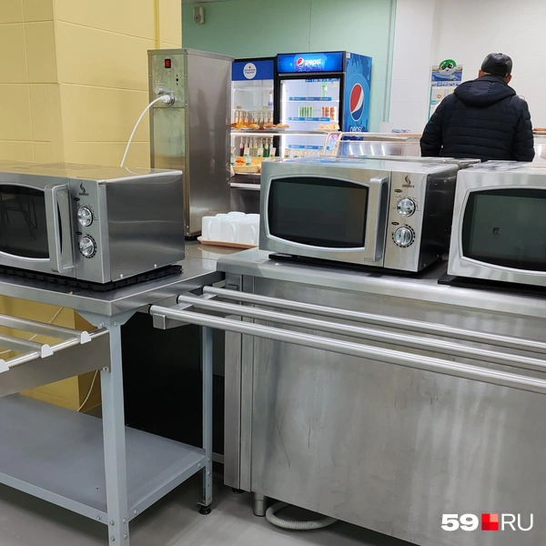 Если еда окажется недостаточно горячей, ее можно подогреть: в центре зала стоят микроволновки. Рядом с ними — кипяток и чашки для чая.