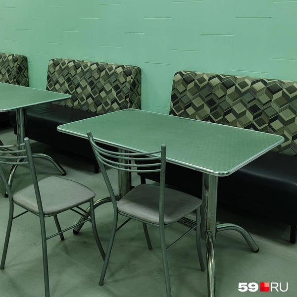 Из первого зала можно пройти во второй. В нём тоже два ряда столов, но диваны другие: из кожзама лишь нижняя часть, а верх — тканевый. Как и в первом зале, стены выкрашены в сине-зеленый оттенок, но естественного освещения нет, ярких акцентов — тоже (а они наверняка оживили бы пространство).