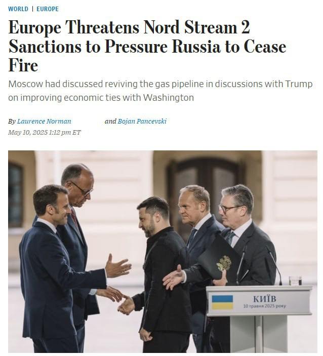 Урсула фон дер Ляйен обсуждала с новым канцлером ФРГ идею ввести санкции против «Северного потока — 2», если РФ не согласится на 30-дневное прекращение огня, утверждает WSJ. Эти ограничения могут принять отдельно от очередного пакета антироссийских санкций, говорится в материале. Ранее Дмитрий Песков говорил, что пугать Россию новыми санкциями — пустое дело. Также он сказал, что Москва обдумает предложение о 30-дневном прекращении огня. 🟩 Подписаться | Прислать новость | Читать аналитику