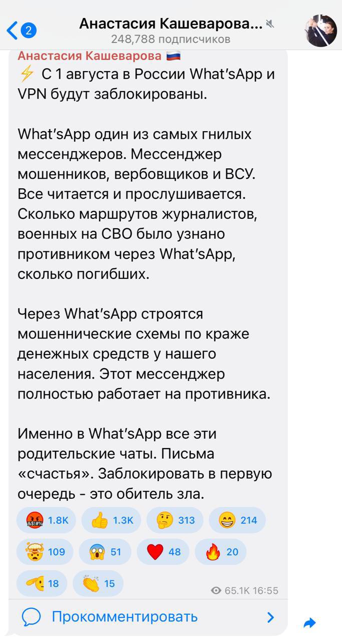 У себя в телеграмм-канале Кашеварова написала, что «What’sApp - один из самых гнилых мессенджеров. Мессенджер мошенников, вербовщиков и ВСУ. Все читается и прослушивается. Сколько маршрутов журналистов, военных на СВО было узнано противником через What’sApp, сколько погибших… Этот мессенджер полностью работает на противника».