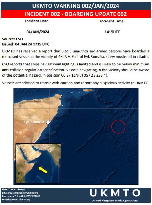 ⚡️Неизвестные вооруженные лица захватили торговое судно близ Сомали Служба морских торговых операций Великобритании сообщила, что от 5 до 6 вооруженных военнослужащих атаковали торговое судно к востоку от Эйла, Сомали. Кто именно стоит за очередной атакой, - йеменское движение "Ансарулла" или сомалицские пираты, пока неизвестно.