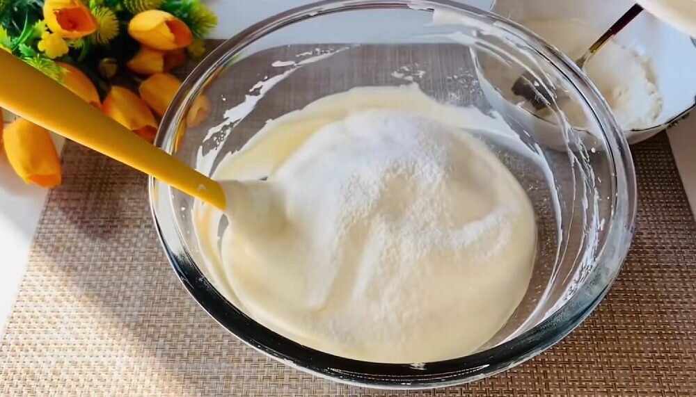2 Всыпаем к белкам сахар. Хорошенько всё взбиваем до получения пышной плотной массы. Добавляем к ней яичные желтки. Аккуратно перемешиваем кулинарной лопаткой.