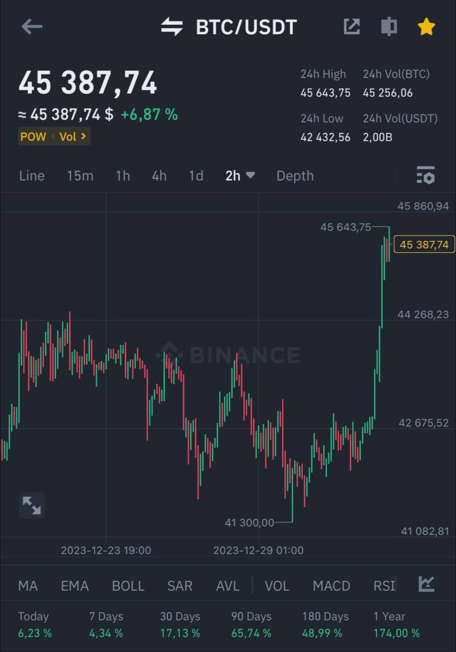 С начала года BTC уже вырос на 7%. Чтобы обновить исторический максимум Биткоин должен вырасти ещё на 50%. Выглядит вполне реально, учитывая, что за 2023 год стоимость Bitcoin возросла на 160%.