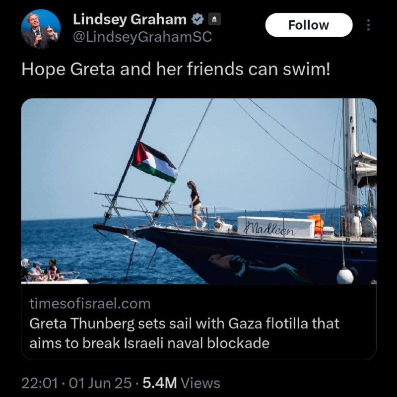 Американский сенатор Грэм (в списке террористов и экстремистов) надеется, что Израиль отправит на корм рыбам корабль с Гретой Тунберг, который направился в Палестину.