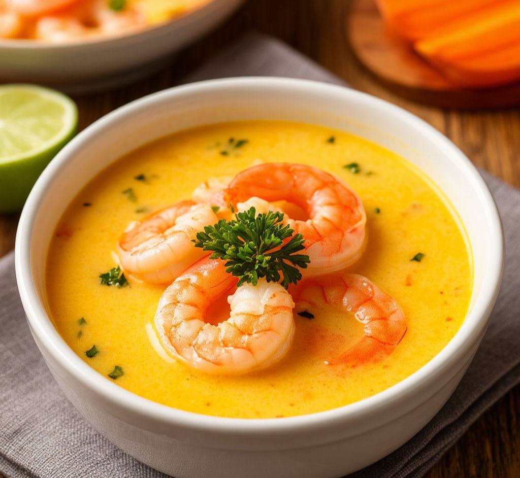 2. Влить бульон и довести до кипения. Убавить огонь до умеренного, накрыть крышкой и варить до готовности картофеля. Влить молоко и довести до кипения. Положить в суп креветки и плавленный сыр, добавить соль и перец. Варить 3–5 минут на умеренном огне.