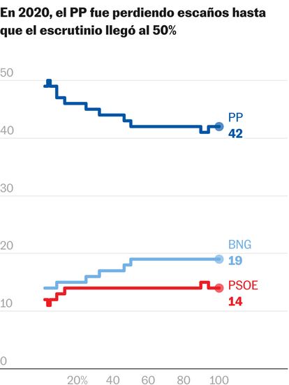 Igual que con la participación, conviene ser cautos con las cifras que se publican al inicio del conteo, cuando se ha escrutado menos del 10% o el 15%. Estos datos suelen llegar una media hora después del cierre de las urnas. El siguiente gráfico muestra cómo evolucionó el recuento en los pasados comicios: el PP fue de más a menos; el BNG fue de menos a más.