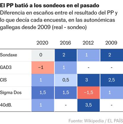 La historia de los sondeos en Galicia es favorable al PP, como analizaba Kiko Llaneras en su newsletter. En el pasado, los populares han batido las estimaciones de las encuestadoras, especialmente en 2009 y 2016, aunque no tanto en los últimos comicios de 2020. Por supuesto, este patrón se puede romper.