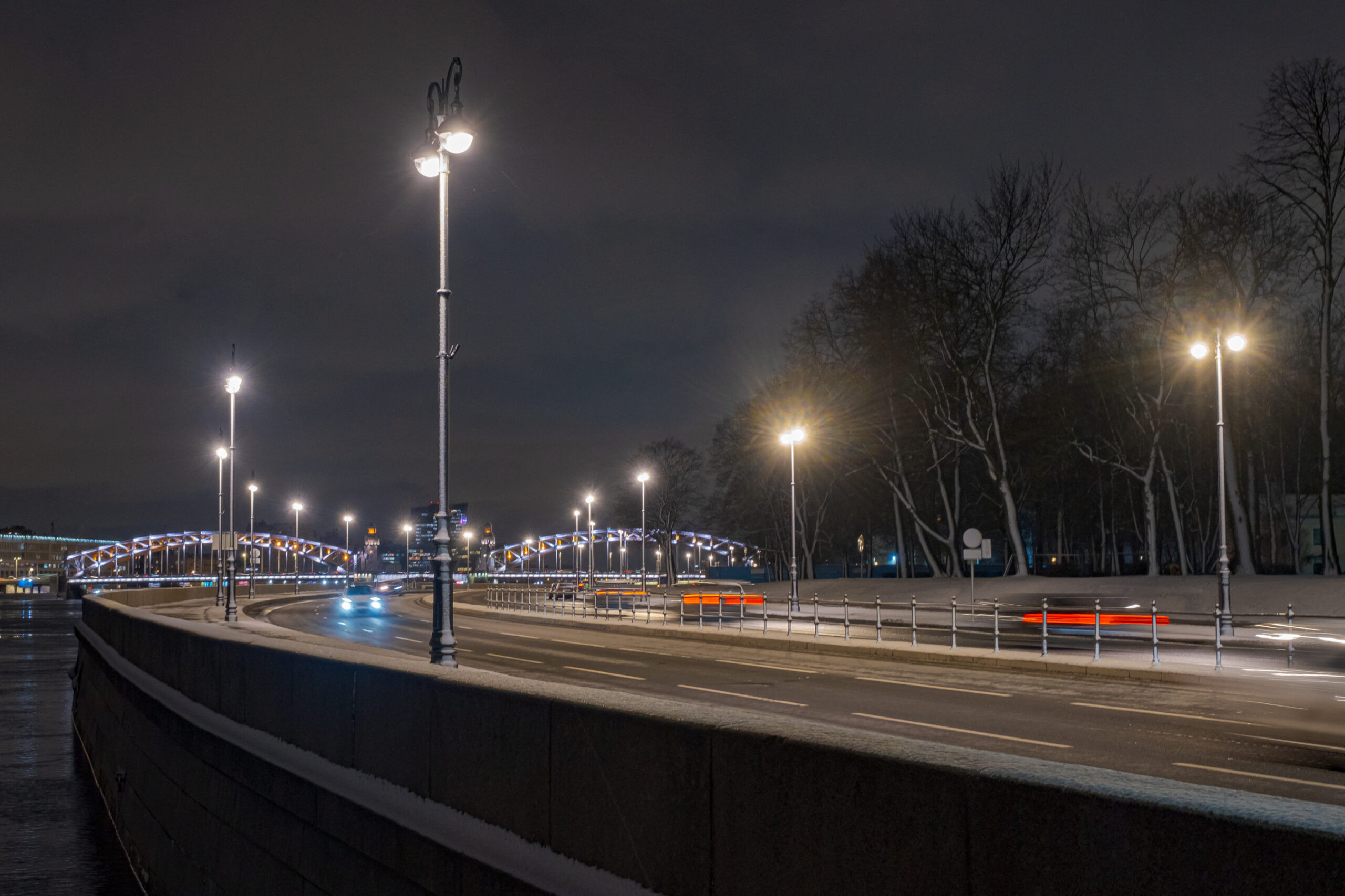 Смольную набережную на всем ее протяжении осветили декоративные чугунные фонари. Завершился второй этап реконструкции наружного освещения, который проводился на участке от Смольной улицы до Смольного проспекта.