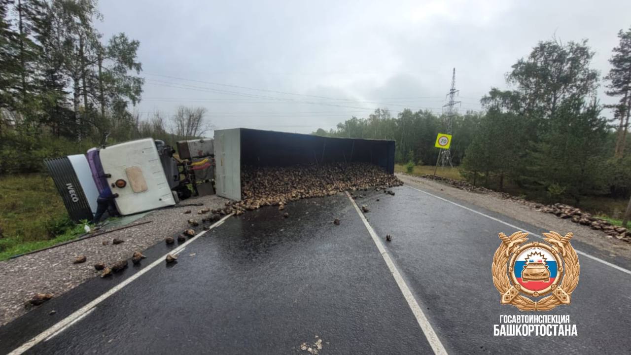 ДТП произошло сегодня в десятом часу утра на автодороге Чишмы-Аксеново-Киргиз-Мияки. Предварительно установлено, что 46-летний мужчина за рулём автомобиля "Ивеко" с полуприцепом груженой сахарной свеклой, двигаясь в сторону села Раевский, на затяжном повороте не справился с управлением и допустил опрокидывание транспорта.