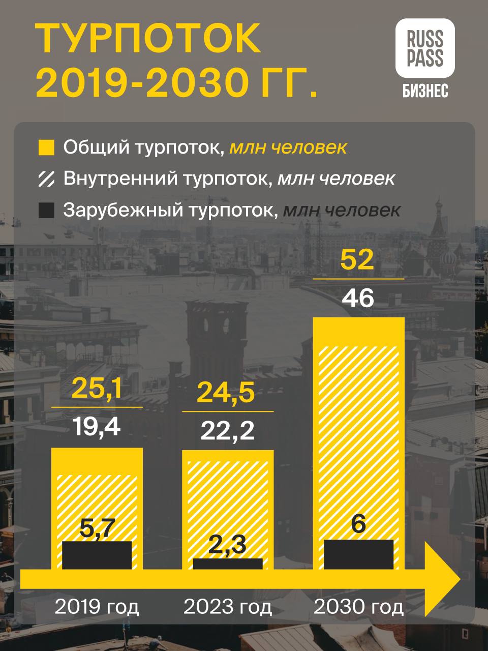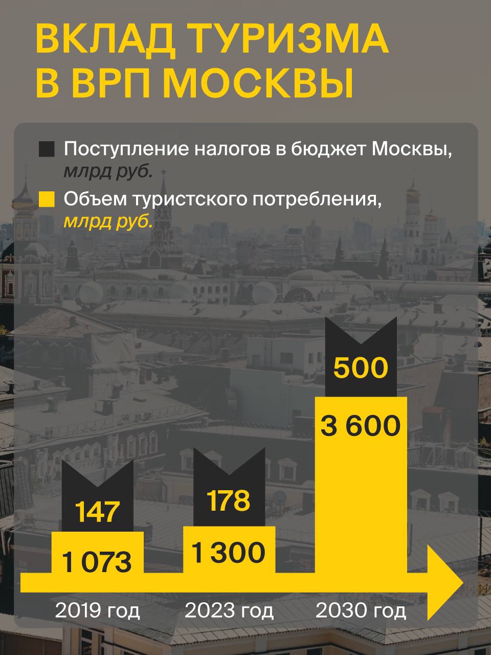 ✔️ Планируется, что на долю Москвы придется 35–40% от общего числа туристов в нашей стране — 52 млн человек. Плюс город будет ежегодно принимать примерно 20 млн экскурсантов. При этом выручка отрасли вырастет в 2,7 раза — до 3,6 трлн рублей, а вклад туризма в ВРП Москвы увеличится до 8%.