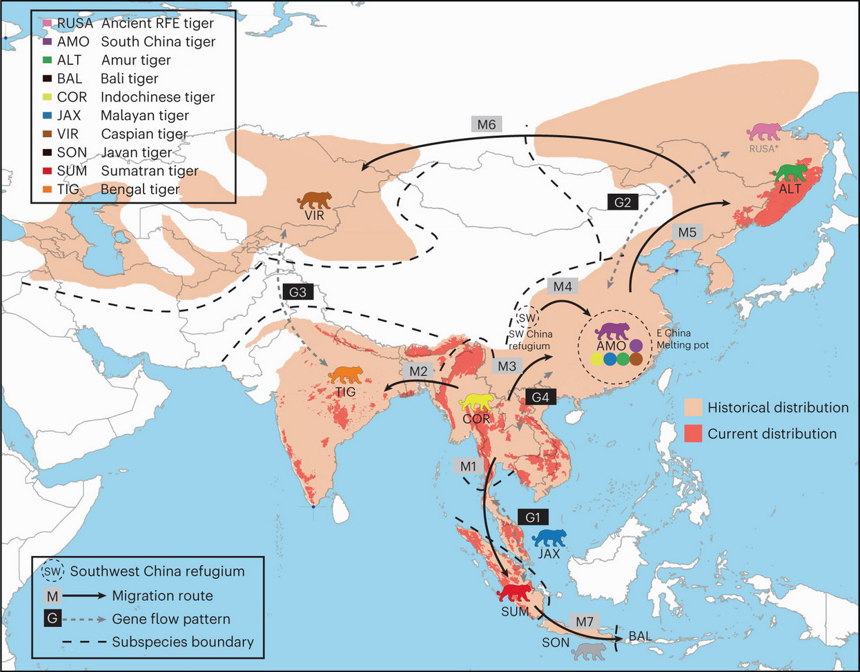 Распространение тигров через Китай в Северо-Восточную Азию, а затем на запад в Среднюю Азию соединило северные подвиды, такие как амурский и каспийский тигры, с южными материковыми подвидами — бенгальским и индокитайским тиграми.