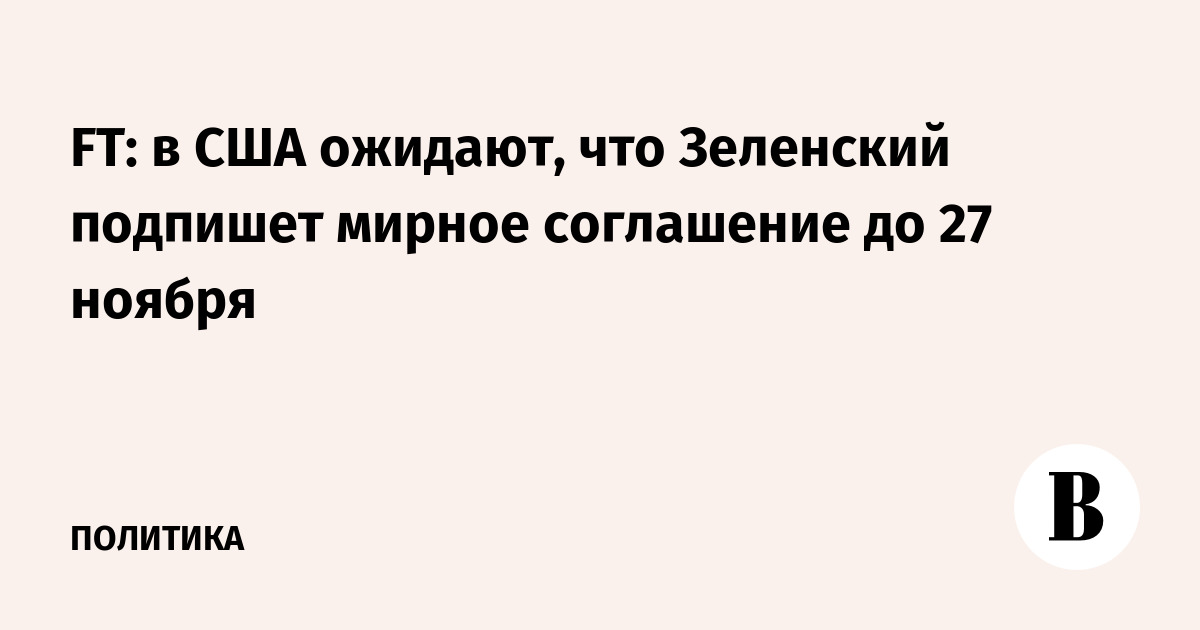 В администрации США ожидают, что президент Украины Владимир Зеленский подпишет мирное соглашение до Дня благодарения – 27 ноября. Об этом пишет газета Financial Times.