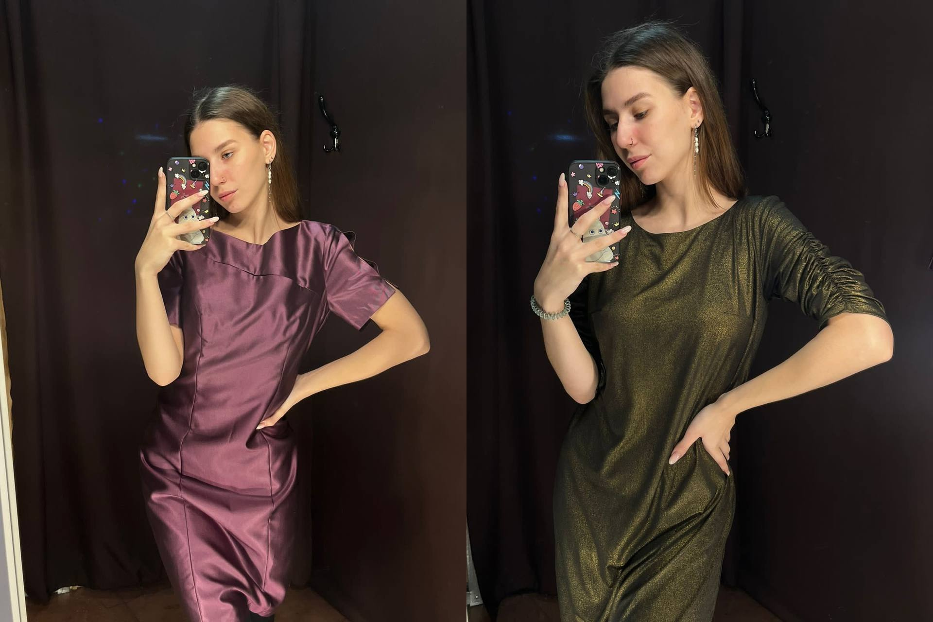 Если вы всё же приверженец платьев, то присмотритесь к блестящим и металлизированным фактурам. Такие есть, например, в секонд-хенде «ЕвроБУМ».