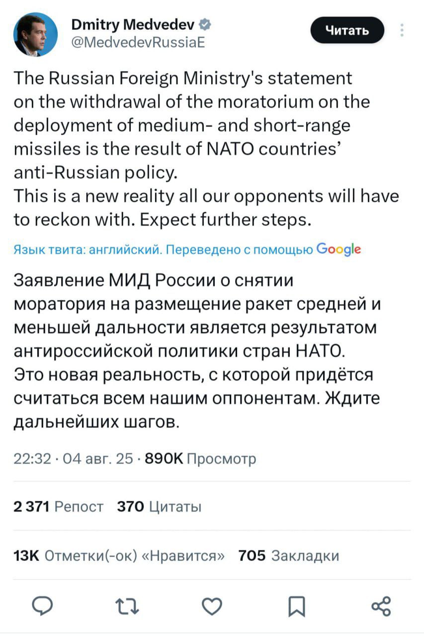 Заявление Дмитрия Медведева и том, что Россия будет размещать ракеты средней и малой должности у границ НАТО. В ответ на то, что США уже делают это.